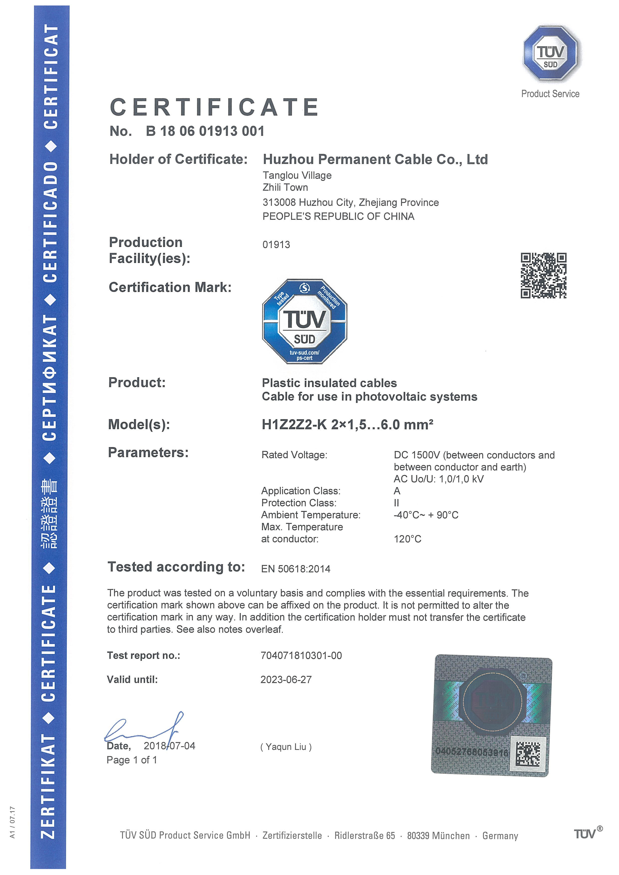2016年--2018年,我司先后獲得了CE證書和TUV證書, 通過了SGS的第三方驗廠。2017年-2018年,2年的時間內,在新能源領域--光伏電纜, 取得了重大進步。